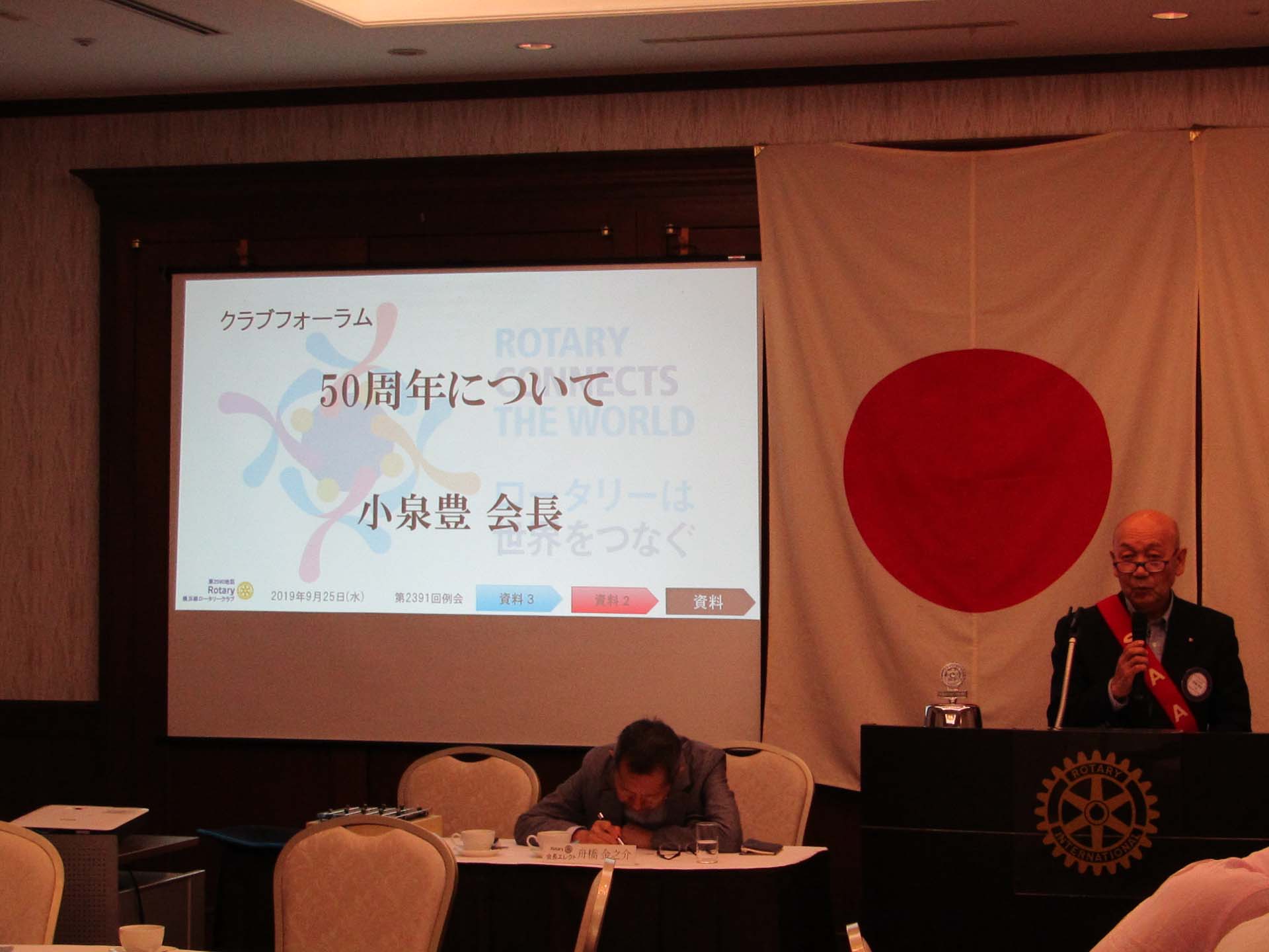 下中英輝 会員 | 小泉会長、本日のクラブフォーラムよろしくお願いいたします。 |
