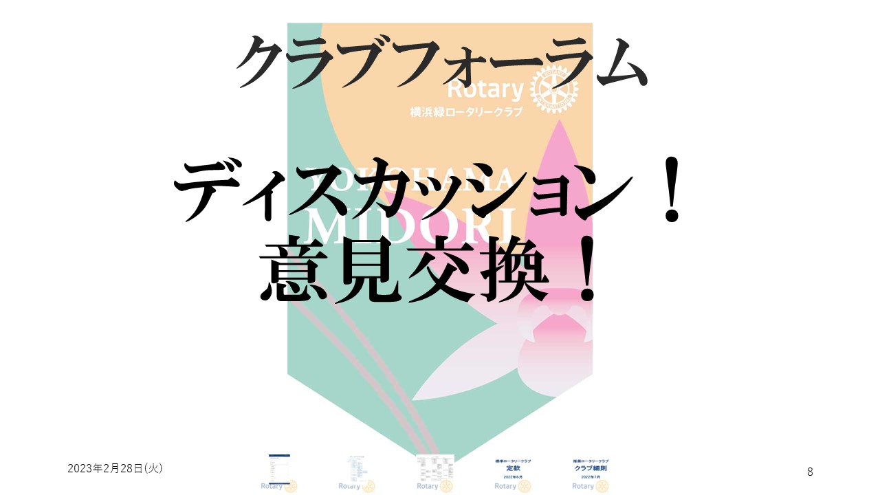 浅井優子 会員 | ・長根 事務局長様、本日のクラブフォーラムよろしくお願いいたします。 ・北原会員、お誕生日おめでとうございます。 |