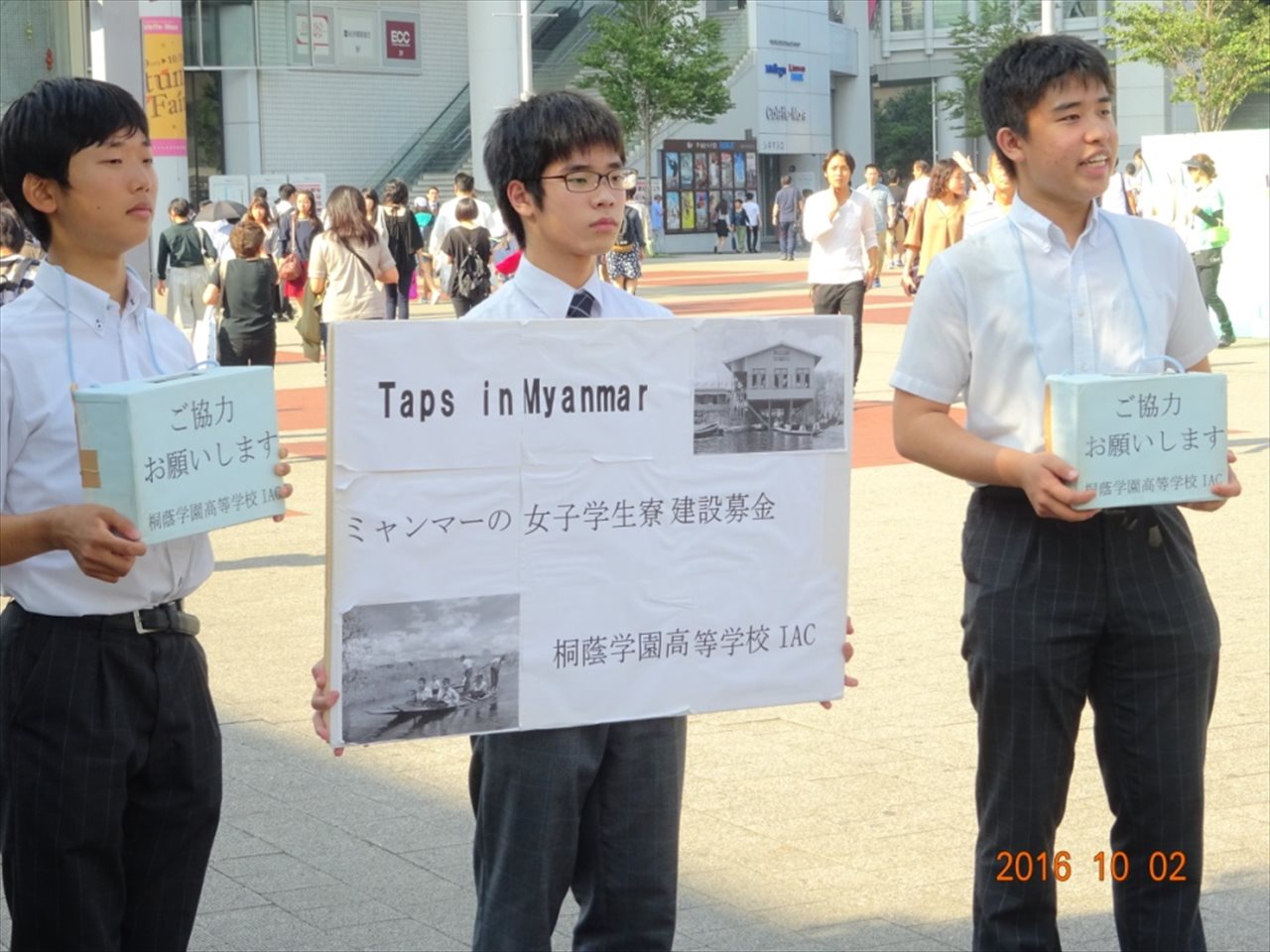 10月2日 桐蔭学園IAC 街頭募金活動 投稿者: Manager2016/10/072016/10/072016-17年度、インターアクトクラブ、トッピクス、ニュース、ロータリー年度、活動内容、青少年奉仕 10月2日(日)に桜木町駅前で桐蔭学園高校・中等教育学校IACが共同でミャンマーの女子学生寮建設募金活動を行いました。 当クラブからは、北原会員と舟橋が参加をして参りました。 桐蔭学園の皆さんの真摯な態度は、募金活動前を往来する人々にとても好感をもたれた様に感じました。 この日はいつも以上の金額が集まり充実した募金活動となりました。 快く募金してくださった皆さんに大感謝! 報告:舟橋金之介 関連