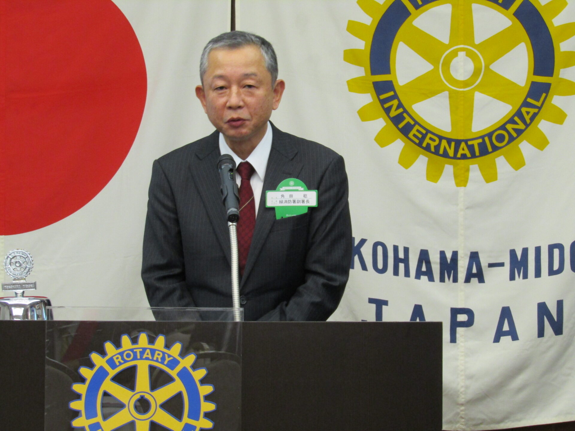 井上幸治 幹事 | 緑消防署 副署長 角田稔様 本日は、ようこそおいで下さいました。卓話よろしくお願い致します。 |