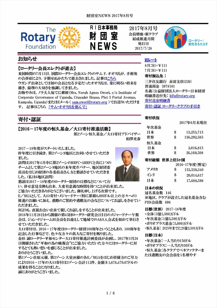 「財団室NEWS 2017年 8月号」掲載 投稿者: Manager2017/08/022017-18年度、トッピクス、ニュース、ロータリー年度、ロータリー財団、財団室NEWS 「財団室NEWS 2017年 8月号」を掲載ならびに「ダウンロード」に追加しました。 「財団室NEWS」ページでは、PDFでの表示及びダウンロードが可能になっています。 詳細は下記をクリック [bmn url=”https://rcmidori.org/trf-news” domain=”rcmidori.org”]財団室NEWS – 横浜緑ロータリークラブ[/bmn] 関連